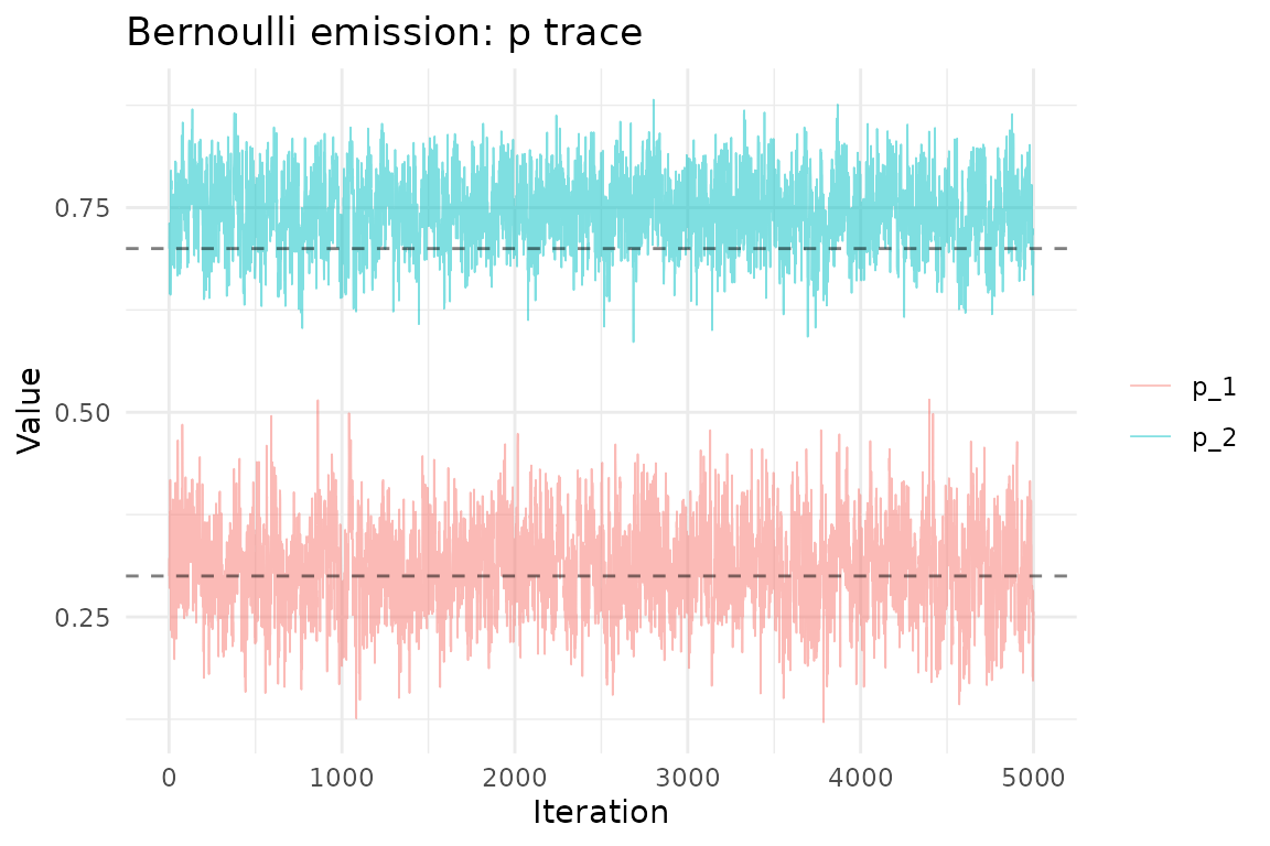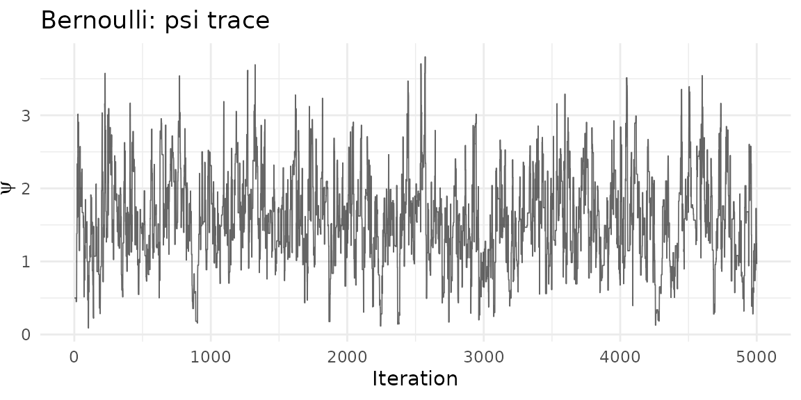labs(title = "Bernoulli: psi trace", x = "Iteration", y = expression(psi))