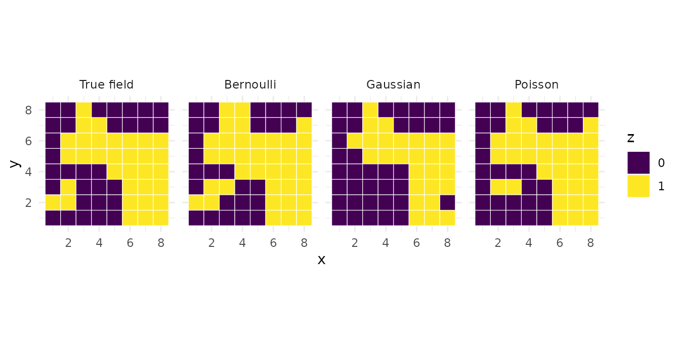 panel = rep(c("True field", "Bernoulli", "Gaussian", "Poisson"),
