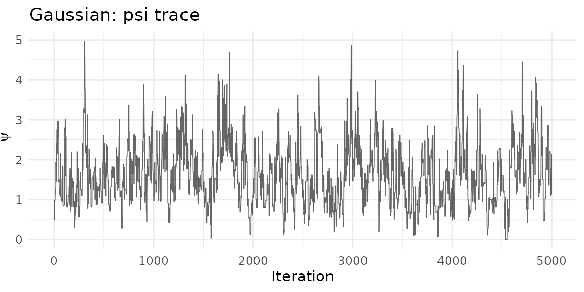 labs(title = "Gaussian: psi trace", x = "Iteration", y = expression(psi))