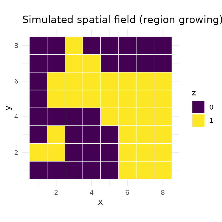 labs(title = "Simulated spatial field (region growing)", fill = "z")
